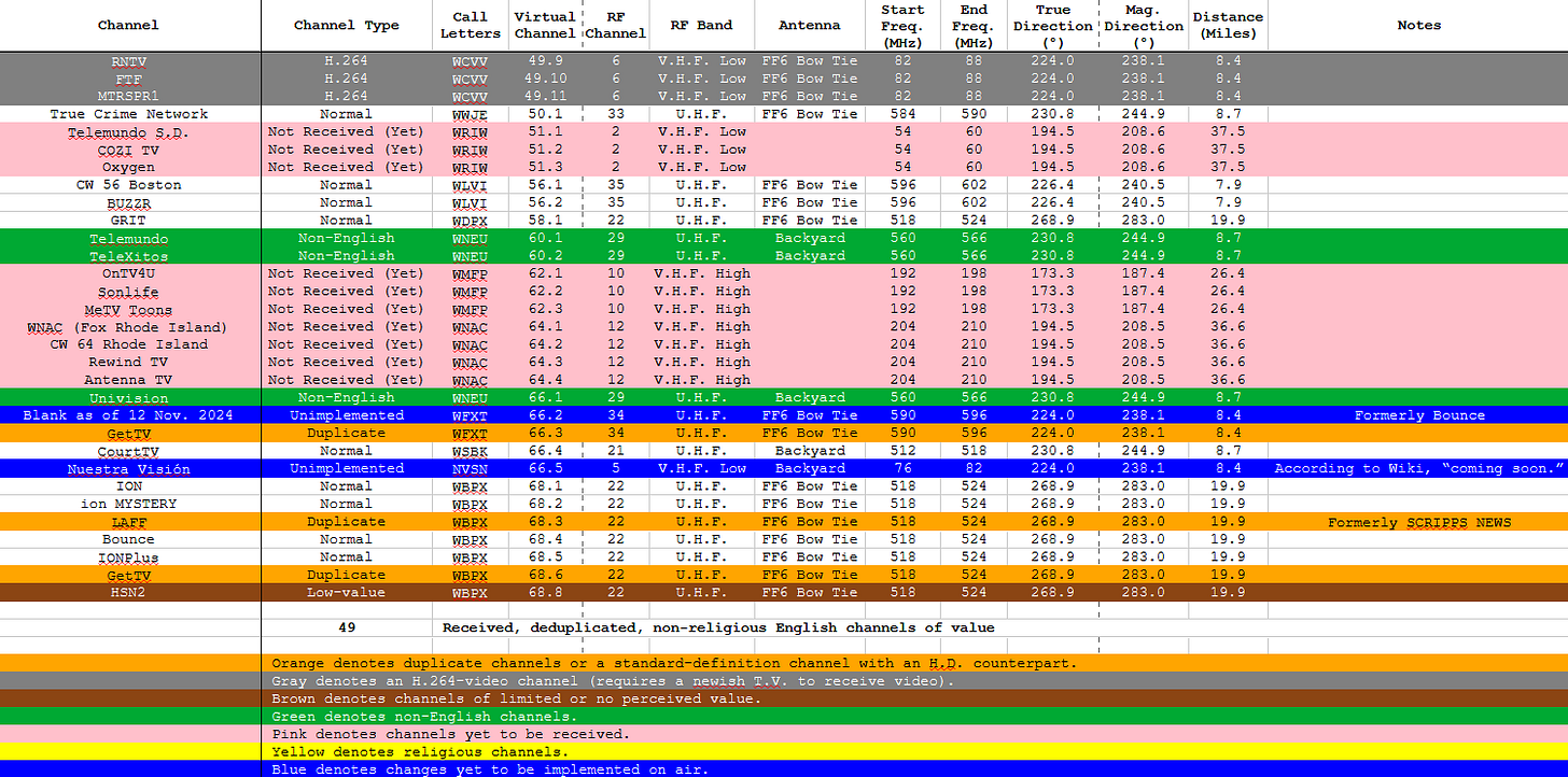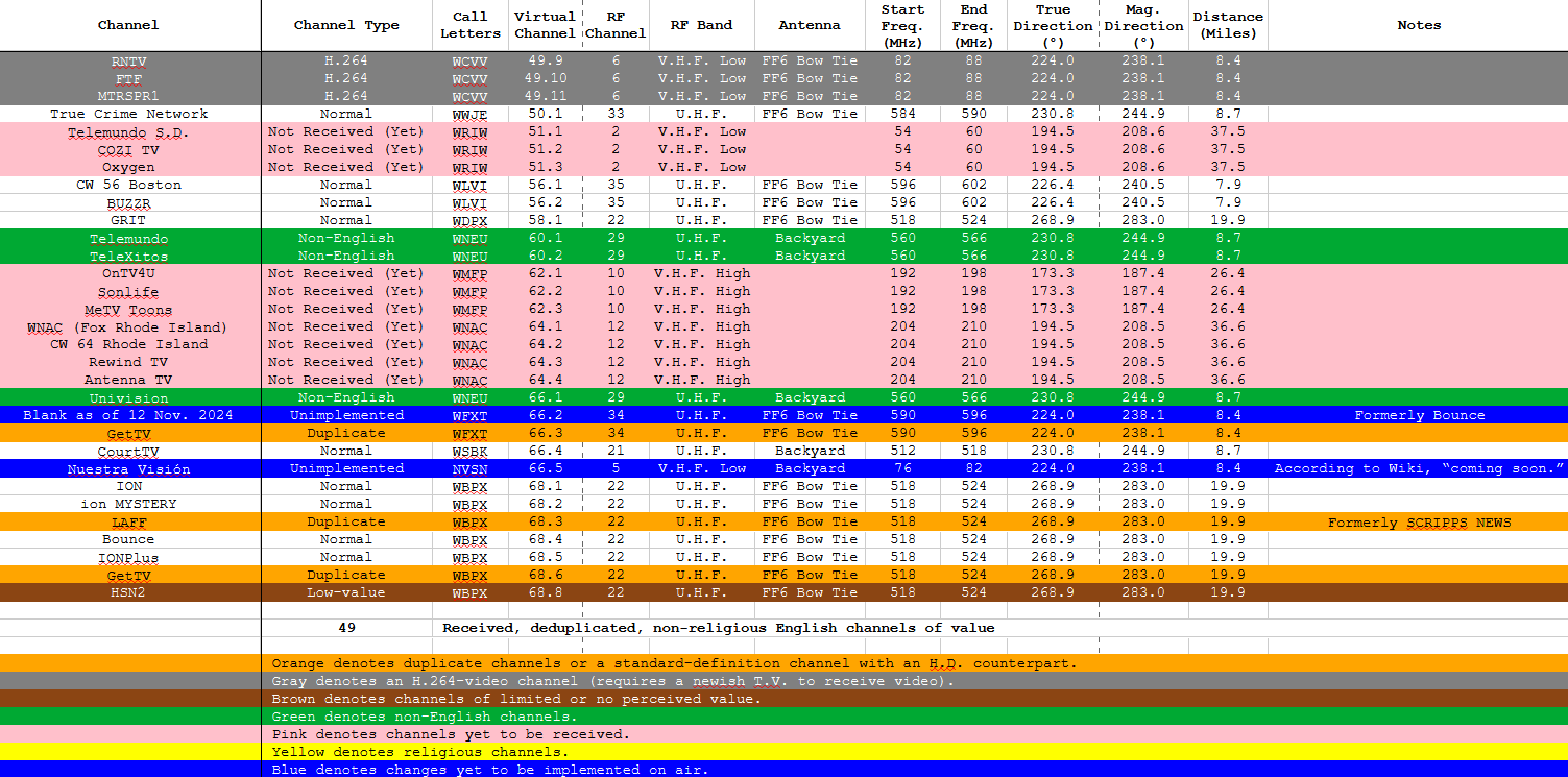 Replace the channels in rows 2–132 with the channels available in your area. Changing the channel type (column B) will automatically update the row’s color and the received-channel count near the bottom. Changing the R.F. Channel (column E) will automatically update the R.F. band, antenna, start and end frequencies, magnetic and true directions and distance (columns F–L). If you found any new transmitters during the F.C.C. facility search, above, you may have to Google or use other tools to identify virtual channels you are yet to receive.