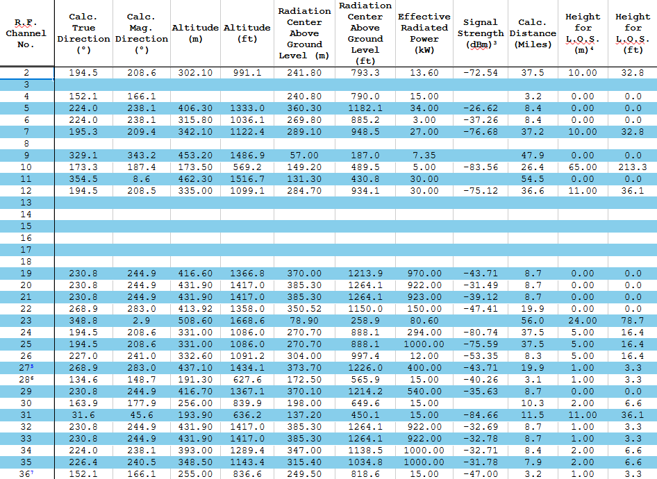 Scroll down to the channel’s antenna information, which includes its Latitude, Longitude, “ERP” (Effective Radiated Power), “RCAMSL” (Radiation Center Above Mean Sea Level) and “RCAGL” (Radiation Center Above Ground Level).